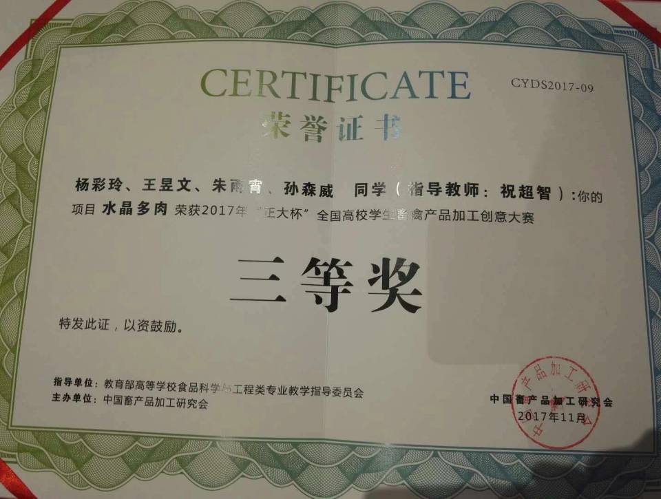 食品科学与工程类专业教学指导委员会指导,国家一级学会中国畜产品加工研究会主办的2017年“正大杯”全国高校学生畜禽产品加工创意大赛并荣获三等奖。