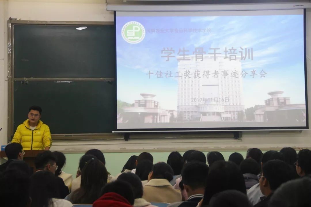 在文化路校区工程楼102教室举办“奋斗的青春最美丽”十佳社工奖获得者事迹分享会。院十佳社工奖获得者代表及学生骨干代表参加会议。