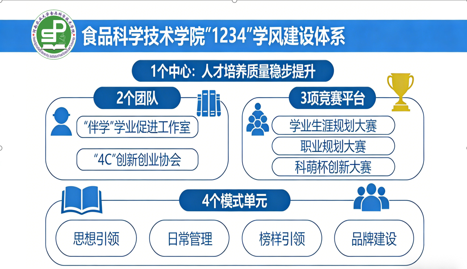 “勤学•笃行学风建设活动”总体部署,以“思想引领、日常管理、榜样引领、品牌建设”为思路,着力强化学风建设。通过实施“1234”体系,引导学生明确学习目标、转变学习观念,实现“从要我学到我要学”的根本转变,学生出勤率、就业率稳步上升,旷课率、挂科率、违纪率明显下降,红桃视频